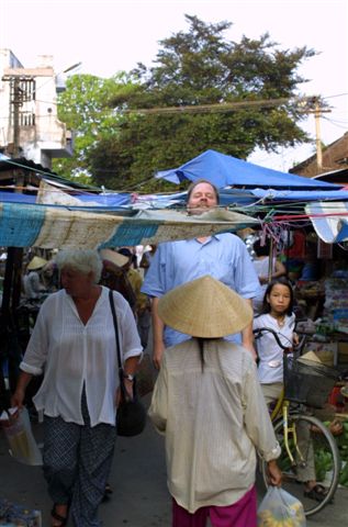 Hugh has trouble walking in Hoi An's market because everything is designed for small people |
