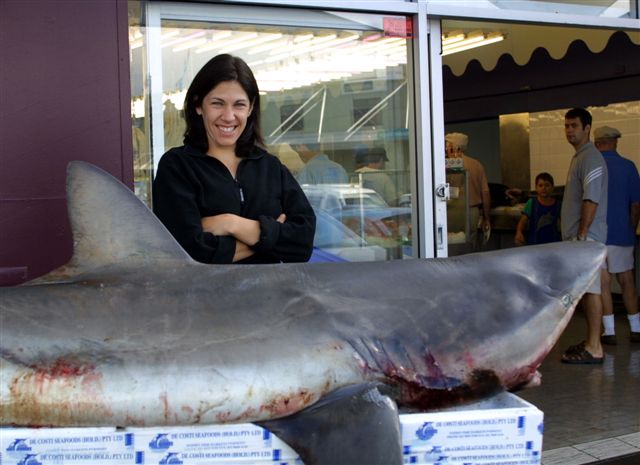This shark was caught in nets outside of Sydney Harbor and brought back to the famous Sydney fish market. This particular shark was still alive at the time this picture was snapped and that is why Chris is standing back. |