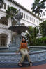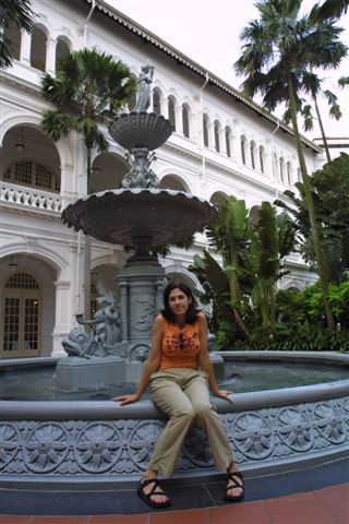 Chris enjoys a rest at the fountain in the courtyard of the famous Raffles Hotel |