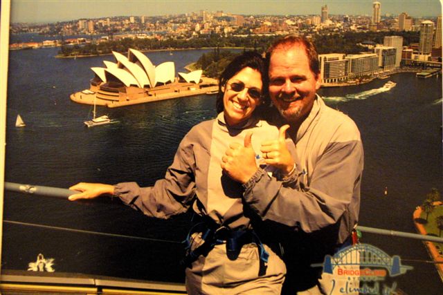 Chris and Hugh on top of the Sydney Harbor bridge in 100 degree heat wearing nylon track suits. The views were awesome, which made the climb worth it. |