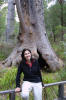Chris, now on the ground, sits in front of the Grandmother Tingle tree. It's about 25 feet behind her so it's hard to see the scale of how big it is. |